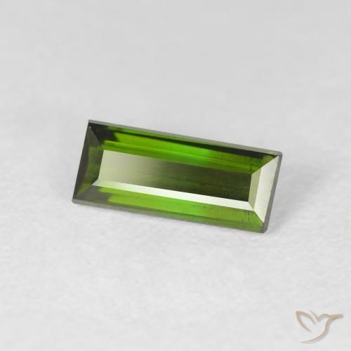 Dies ist ein natürlicher, dunkelgrün Turmalin-Edelstein mit 1.01 Karat, 1 Stück in Baguette Form mit einer genauen Größe von 8.68 x 3.69 x 3.23 mm. Dieser lose Turmalin wurde in Mosambik abgebaut und hat die Reinheit VS (augenrein). Dieser natürliche Turmalin wurde nicht behandelt.